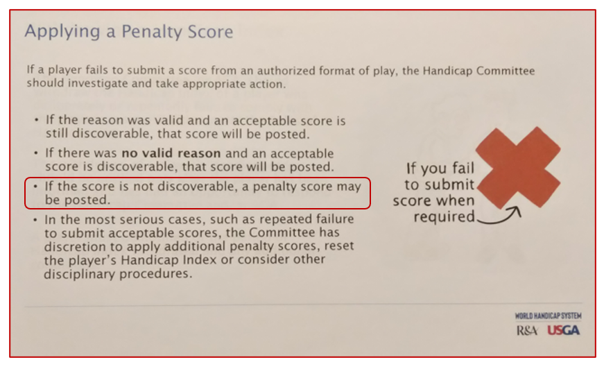 It is paramount that all members post the score of all rounds played outside the club (format permitting - no posting is required for formats such as a Scramble, Alternate Shot, etc.). The Handicap Committee may apply a Penalty Score under certain conditions. The following is excerpted from the Rules of Handicapping. Any score that falls under the third bullet outlined below, will be posted by the Handicap Committee as an even par 72.